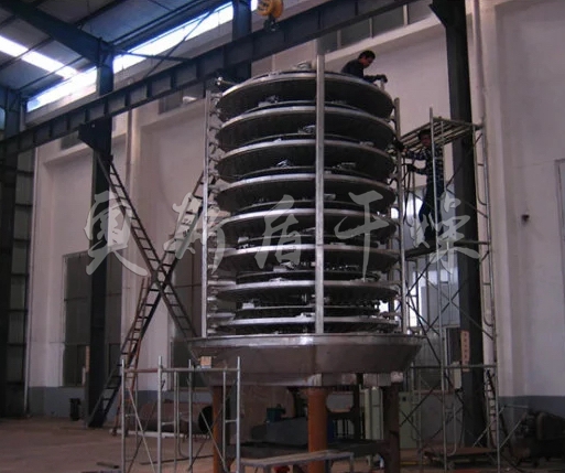 湿物料自加料器连续地加到干燥器上部第一层干燥盘上,带有耙叶的耙臂作回转运动使耙臂作回转运动使耙叶连续地翻抄物料。物料沿指数螺旋线流过干燥盘表面,在小干燥盘上的物料被移送到外缘,并在外缘落到下方的大干燥盘外缘,在大干盘上物料向里移动并从中间落料口落如下一层小干燥盘中。大小干燥盘上下交替排列,物料得以连续地流过整个干燥器。中空的干燥盘内通入加热介质,加热介质形式有饱和蒸汽、热水和导热油,加热介质由干燥盘的一端进入,从另一端导出。已干物料从后一层干燥盘落到壳体的底层,后被耙叶移送到出料口排出。湿份从物料中逸出,由设在顶盖上的排湿口排出,真空型盘式干燥器的湿气由设在顶盖上的真空泵口排出。从底层排出的干物料可直接包装。通过配加翅片加热器、溶剂回收冷凝器、袋式除尘器、干料返混机构、引风机等辅机,可提高其干燥的生产能力,干燥膏糊状和热敏性物 料,可方便地回收溶剂,并能进行热解和反应操作。